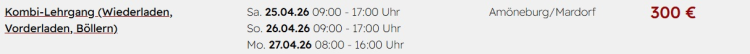 Anmeldung zum Kombi-Lehrgang nach dem Sprengstoffgesetz (Wiederladen, Vorderladen, Böllern) vom 25.04.26 - 27.04.26 in Mardorf über den unten stehendem Link. Achtung: Begrenzte Teilnehmeranzahl.